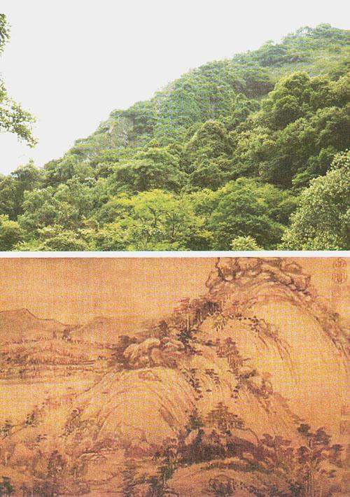 《富春山居图》中的山岭,在起伏的节奏上,与实际的山景出入不大,都是典型的江南峰峦,轮廓柔和,起伏和缓;然画中山岭的造型,比照实山,乍看之下,有很大的差异,完全不类。画山与真山主要的不同点在于画的山头堆满了巨大的怪石,而与远观的实景看似毫无关系。