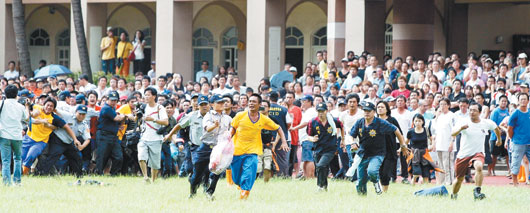 台湾救援直升机昨天陆续载出高雄县小林、六龟灾区村民,在旗山中学守候的家属等不及直升机降落就往前冲,警察连忙紧追拦人。图片来源:台湾《联合报》