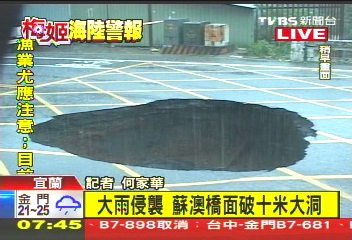中国台湾网10月22日消息 据台湾TVBS电视台报道,台湾宜兰苏澳降雨量累积达939毫米,刷新去年8月8日“莫拉克”台风在台东大武创造的808.5毫米的最高纪录。昨(21)日,苏澳一座涌泉桥因为地基被暴雨淘空,桥面上破了一个10米宽的大洞。
