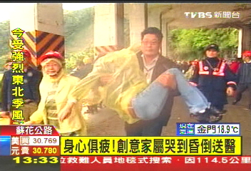 中国台湾网10月27日消息 据台湾TVBS电视台报道,苏花公路搜救行动已进入第7天,20名失联大陆游客的任何消息都牵动着他们家属的心。焦急等待的心情加上恶劣气候,使得一名创意旅行社失联大陆游客家属在今(27)日中午哭到昏倒,送医救治。