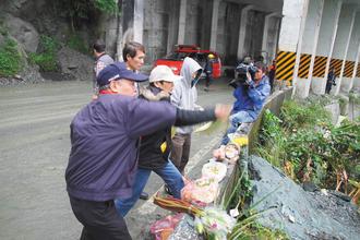 创意旅行社司机郭铭麟及导游曾庆华的家属,昨天带着冥纸及鲜花到112.8公里处祭拜。(图:台湾《联合报》)