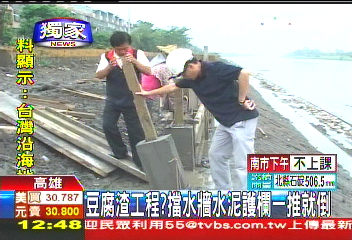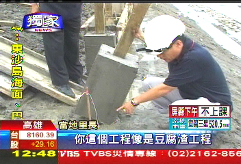 据画面显示,前来调查的一名高雄市议员可以不费力的用2根手指把水泥台座推倒,工程的“豆腐渣”程度还真让人不可思议。高雄市楠梓地区里长怕水灾噩梦重演,要求承包商立即停工调查。承包商表示,这是图纸公司设计问题,我们只是按照图施工。