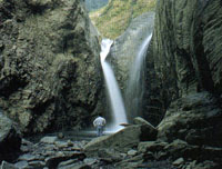 来义乡位于大武山地垒西南,风光清新自然,由于地形落差大,雨量丰沛,素有瀑布之乡的美誉。其中以位于大后溪(托阿沃溪)上游的鸳鸯瀑布和本社溪支流上的丹林瀑群最为人知,可及性也较高;每年11月至翌年2月,成群的紫斑蝶翩翩飞舞,更为山林增添壮丽风采。 鸳鸯瀑布位于林边溪支流大后溪中段,一路奔腾的溪流在此跃入平原,落差达200公尺以上,形成多达四层的大瀑布,目前尚无道路通达,仅最下方一层可以溯溪方式亲近,其余只能远观。溯溪起点位于客醉山庄下方溪谷,初时走来尚称平坦,行约20分钟,溪谷更加开阔,驻足瞭望可远眺南大武山群峰;由此之后,峡谷又渐收束,行约30分钟后,右方山壁突然横互於前,将溪谷夹峙成深峡,须攀岩、涉水约20分钟才得亲近鸳鸯瀑布。只见沛水将黑色砂岩切出高约30分尺、宽仅5~10公尺的耸峙峡谷,若非日正当中,阳光不至,予人阴森冰冷之感。岩壁上棲息了不少燕子,峡谷尽头只见左右两道白绢倾泻,于河谷上方交会而下,犹如情侣缠绵,故名鸳鸯瀑布。 而丹林瀑布群则位于来义检查哨后方山谷,来社溪的支流上,瀑布多达5层,当中以第三及第五层瀑布最为高大,雨季时流量丰沛,颇为壮观。从检查哨旁循小径进入即抵第一层瀑布,溪水斜冲至一巨石再曲折而下,注入一处深潭。沿左边小径往上爬约10分钟,或由检查哨前进入村落,皆可抵第二层瀑布,此段瀑布高约40公尺,水势顺山壁款款流泻,瀑前的宽敞沙地可搭数顶帐篷,是赏瀑、露营的好地方。往南循山径攀爬约40分钟,来到第三层瀑布,雄伟壮观,瀑面广阔,水气飘然,立于瀑前巨岩上,暑气全消!从此爬上约30公尺的陡坡,半小时后,可抵第四层袖珍型瀑布,瀑底的岩石被激流切割得纹理分明,煞是好看。再顺右侧小径走到瀑布顶端后,涉山溪直上,约20分钟即可抵第五层瀑布,高约百公尺,水势雄壮,扣人心弦。来社溪挟着丰沛的水量从茶仁、衣丁山区一路奔来,下切成深逾百公尺的来义大峡谷,当中蕴藏着无限美景,特别是上游的峡谷地区,来汇的支流遇上断崖,形成一道道瀑布,更见壮观风光。由来义山庄前吊桥渡溪,沿溪畔步道上行,半小时路程可抵一处排湾语称为“佳佳那阿道”的地方,瀑水从高崖上疾奔而下,冲出一涧深潭,潭水深湛剔透,美如神话之境。
