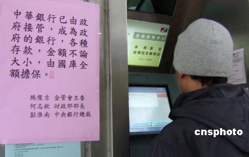 一月七日,一位市民在台北的“中华银行”柜员机上尝试取款,但没有成功。因力霸和嘉食化两家公司申请重整,引发“中华银行”储户严重挤兑,单日挤兑额近二百亿元台币,当地媒体惊呼“金融风暴”来了。台湾“金管会”宣布于六日凌晨开始正式接管“中华银行”,八日将提供三百亿台币现金应付提款。中新社发张炜摄