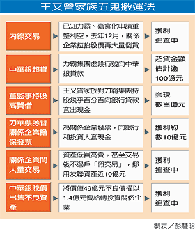 检调15日指挥“调查局”北机组、台北市调处等单位,针对“中华银超贷案”、“力霸、嘉食化内线交易”、“亚太固网背信案”三大区块发动搜索,并将“中华银行”副总经理的王令侨、翊兴资产管理公司王令兴,及王又曾二房陈佩芳等多名关系人约谈到案。