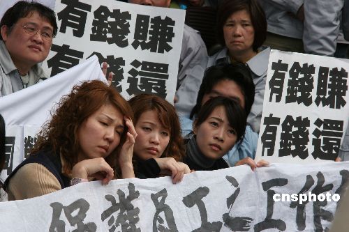 力霸财务风暴在台湾持续延烧。一月十一日,宜兰、桃园数十名力霸员工忧心生计不保,前往台北力霸集团总部、“行政院”、“立法院”陈情抗议,呼吁尊重员工权益,解除对力霸关系企业的资金扣押。 中新社发 董会峰 摄