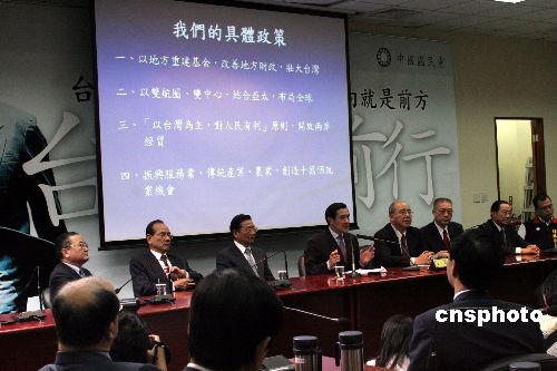 5月2日,中国国民党中常会通过正式提名马英九代表该党2008年竞逐台湾领导人。随后,马英九来到国民党中央党部,发表题为“台湾必须大步向前行”声明。图为马英九(右2)在国民党主席吴伯雄(右)、副主席江丙坤(左2)、林丰正(左)等陪同下,提出参选政见。 中新社发 黄少华 摄