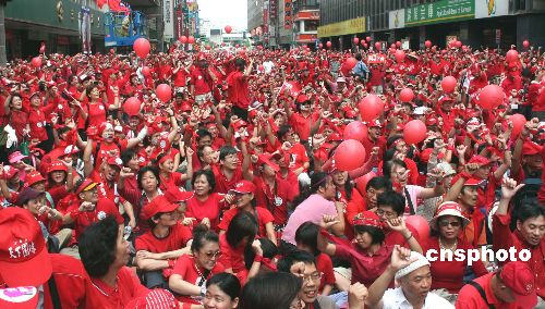 台湾“百万人民反贪腐”总部发起的“天下围攻”活动,2006年10月10日上午在台北市中心地区上演。大批民众齐呼“倒扁”口号,表达反贪腐诉求。 中新社发 黄少华 摄