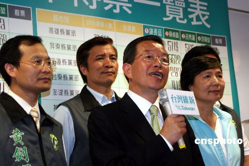 五月六日,民进党举办二00八年台湾地区领导人候选人党内初选的党员投票。谢长廷以六万两千八百四十九票,夺得第一名。民进党目前有合资格的投票党员为二十五万四千多人,此次投票率为百分之五十六点零六。图为谢长廷在投票结果基本底定后,于其竞选总部向媒体发表讲话。 中新社发 黄少华 摄