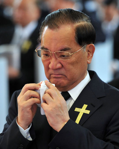 中国国民党荣誉主席连战(如图)母亲赵兰坤追思会28日在台北举行,连战在追思会上表情肃穆,不时拭泪。 图片来源:“中央社”