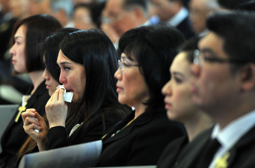 中国国民党荣誉主席连战母亲赵兰坤追思会28日在台北举行,连战女儿连惠心(左3)在追思会上频频拭泪。 图片来源:“中央社”