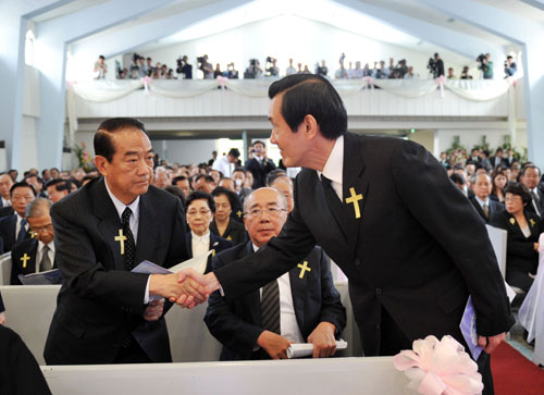 马英九(右)28日在台北出席国民党荣誉主席连战母亲赵兰坤追思会,向亲民党主席宋楚瑜(左)握手致意。 图片来源:“中央社”