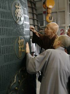 据了解,该法华钟是法鼓山委托日本“老子制作所”制作的,现即将制成。该钟仿唐钟造型,浑厚朴实,线条优美,铸有中文七万余言,是日本“老子制作所”有史以来铸字最多的一座巨型梵钟。该钟将于今年年底前运回台湾,安置在法鼓山钟山之麓。