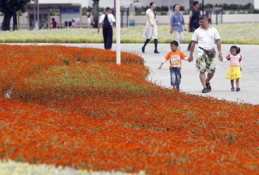 台北花博会9日展开为期 20天、4 阶段测试,开放上千名测试志工进入圆山公园区,许多民众携家带眷前来,一睹园区内的壮观花海。图片来源:“中央社”