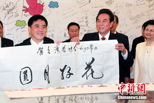 在台北花博营运总部,台北市长郝龙斌向陈云林致赠瓷兔,陈云林则回赠自己的书法“花好月圆”。作者:黄少华