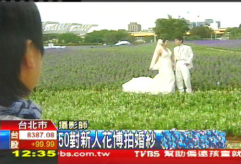 中国台湾网11月1日消息 据台湾TVBS电视台报道,今天(1日),已封闭的台北花博园区为50对新人特别开放,让新人们在美丽的花海中拍婚纱照,大秀恩爱。