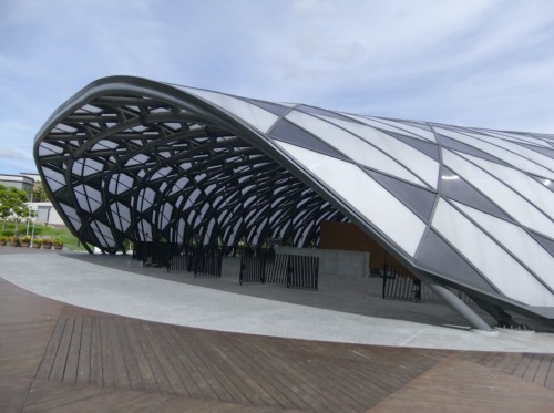这阵子行经美术公园区的市民,无不被园区内的大型蝶蛹吸引--它是舞蝶馆,是台北花博会举行开、闭幕的场馆,也是展期中大型国际文化艺术活动的表演场所;和舞蝶馆整体规划的风味馆是花博官方纪念品旗舰店,这两座由金光裕建筑师事务所负责设计的展馆,亦强调环保永续,依据节能减碳概念,打造视野宽阔、自然通风、采光良好的空间。