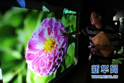 10月13日,在台北花博会“未来馆”内,一名观众在参观大型触摸屏。新华社发(吴景腾 摄)