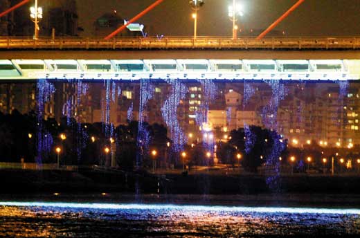 台北花博25日晚开放夜间游览,大佳园区大直桥下亚洲最大的户外数字水幕,首度亮相,一波波秀出各式花博文字、图形,非常吸睛。图片来源:台湾《联合报》