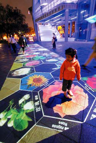 花博四展区,连接美术、圆山两区陆桥下广场的互动光雕包括“花语寄情”、“莲池鱼踪”等和民众互动的花卉,让民众流连往返。图片来源:台湾《联合报》