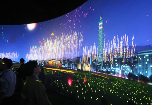 台北花博梦想馆3日举行开幕仪式,受邀贵宾在环型剧场前观看交互式影音动画。图片来源:“中央社”