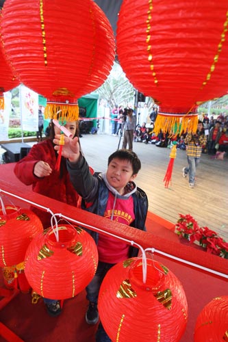 元宵节将至,台北花博新生园区的花梦广场10日举行猜灯谜活动,答对的人可获得花博小礼物。一名工作人员将谜题绑在灯笼上。图片来源:台湾“中央社”