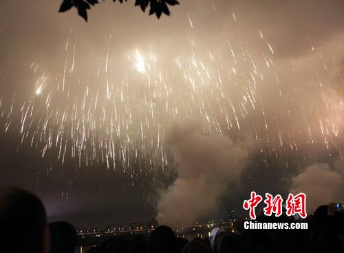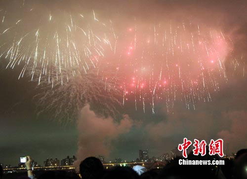 11月6日,台北花博会今天开幕。主办单位自晚间9时开始,从大佳河滨公园施放烟火,再一路沿着基隆河、淡水河串连到压轴的大稻埕码头,吸引很多民众观看。图为在大稻埕码头施放的烟火。