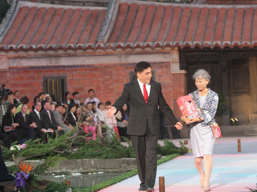台北市长郝龙斌(左) 4日出席在林安泰古厝举行的花博开幕记者会暨“花?裳”展演,邀请“世博奶奶”山田外美代(右)以观光大使身分,号召欣赏花博之美。