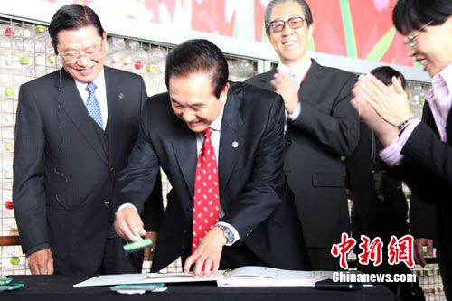 在台北花博营运总部,台北市长郝龙斌向陈云林致赠瓷兔,陈云林则回赠自己的书法“花好月圆”。作者:黄少华