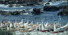 天亦动容的飞鱼祭在雅美人的历法中,分上半年、下半年和飞鱼季三季,其中的飞鱼季约为3~7月,是雅美人一年中最忙碌的日子,此时飞鱼群随黑潮南来,并尾随鬼头刀等大型鱼类的追逐,为雅美人带来丰沛的食物。因此,围绕着飞鱼的一系列祭典,便成为雅美人最慎重应对的仪式。 飞鱼祭为一连串祭典的总称,主要可分为大船招鱼祭、小船招鱼祭、捕鱼祭及丰收贮存日。每年飞鱼季开始时,便要举行最隆重的大鱼招船祭,这天黎明,所有6人以上的大船都齐集海滩,参祭者个个头戴银帽坐在船上,由各船年长者手持短刀、高声诵唱祭辞、呼遵守禁忌,以祈求神的保佑与飞鱼丰收;祭典结束后,每船杀鸡一只,并将鸡血用食指点在卵石上,表示丰收的鱼获将与石共长久。雅美人捕捉飞鱼是于夜间进行,其独特的捕鱼方式是在船尾升起火把,利用鱼的趋光性,将飞鱼引诱至鱼网中。飞鱼虽是雅美人最主要的蛋白质来源,但基于生态平衡,他们并不会贪婪地滥捕,食用不完的飞鱼亦会晒干贮存,使全年食物不虞匮乏。雅美人的舞蹈有浓厚宗教、祭仪的特质,例如新船落成时,男子们便会齐跳“勇士舞”,以驱逐恶灵,一致的动作、刚猛的舞步,展现出雅美男子雄壮威武的一面。而最为人们熟知的雅美舞蹈,是妇女们在节庆时所跳的头发舞;舞蹈时妇女们臂搭着臂,反复做着弯腰、立起的动作,将垂至地面的头发,猛然甩起,造成长发齐扬、力道万钧的视觉震撼,充分结合人体的力与美。 |