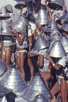 巧夺天工的木舟一般人称兰屿的木船为独木舟,其实雅美人所使用的渔船并非独木舟,而是由27(大船)或21(小船)块大小木料拼组而成的。造船用的木才多达十余种,例如龙骨部分,用的就是榄仁舅、福木、台东龙眼(番龙眼)或赤楠这类质重、耐磨、不会变形的良材,船舵则采质地较轻的白榕气根,小叶桑有遇水膨胀的特性,拿来做木钉最适合不过;船组装好后,再以兰屿花椒、马尼拉麻填缝。一艘兰屿木舟,可以在海浪冲撞、盐雾侵蚀下,使用个四、五十年;早年日本海军的造舰专家赞叹兰屿木舟的外侧流线,与当时最新式的战舰一模一样。船有不加纹饰的白船和雕刻船两种,二者结构相同,但只要具备一定的社会威望,雅美人都会费心为船只雕上美丽的纹饰,其纹型大致分三种,分别是象征船眼的同心圆、代表人的人型纹以及有如波浪的三角纹,并分别漆色;讲究一点的还会在高高翘起的首尾船舷,安上一艘小木舟及插着羽毛的人型木雕,并漆上红、白、黑三色颜彩。建船也是雅美人的一件大事,不仅要先在山里选定树材,同时还要开始养猪羊、新垦芋田,以备造船时祈祷之需。雅美人造船不靠设计图,完全依据年长者的经验传授,每一艘船都是一件艺术品,拥有造舟者不断的祈福和赞颂。新船完成后需经神圣庄严的下水典礼——船祭,方能出海,船祭也成为雅美文化中极重要的一环。典礼从新船下水前一天下午开始,客人均盛装参加,集体围在船边用歌声祝贺赞美舟船的辉煌成就,歌声一直延续到隔日清晨,然后将新船内堆放的芋头分送亲友,并宰猪分肉。船祭最高潮是船员盛装齐集船长门前,向船灵祈祷;接着,全村男子着丁字裤,双手握拳、脚板顿地,嘴中发出叱喝诅咒声,由四面八方涌向新船,船主着胄、戴盔、持矛坐在船上,与之对抗,吼声愈大,愈能使魔鬼却步。最后,大队人马将船抬往海边,把船抛向空中,接住,再抛高;反复多次后,再以逆时针方向在海上绕行一周,典礼即大功告成。
