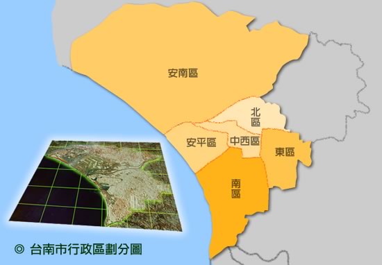 区划 台南市原辖7个区;2004年1月1日,台南市中区与西区合并为中西区,现辖6个区。