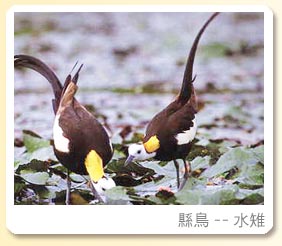 日据时代被列为天然纪念物的水雉(Hydrophasianus chirurgus),体长约52公分,主要于分布于热带、亚热带的湿地,台湾则位于水雉自然分布的地域北界。过去在宝岛各地均可见其踪影,但近几年来,因水雉主要栖息地大部分被改变为农田或建地,使得其族群数量大幅减少,目前已知的繁殖区只限于台南县。水雉蓝灰色的脚趾极长,展开时可将体重分散,故可轻巧地漫步在漂浮水面的植物上,华丽的外表加上优雅的姿态,博得凌波仙子美誉,且其主要栖息于菱角田,故又有菱角鸟之称。