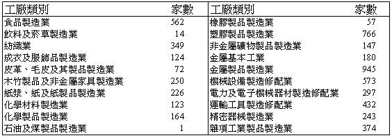 而在工厂类别上,可以发现,由于重化工业的快速发展,本期间化学制品业、金属制品制造业、机械设备制造修配业、电力及电子机械器材业、运输工具业等工厂家数增加率最高,至于其它产业的工厂数,则增加不多。