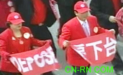 据报道,陈水扁出席今天上午“双十”户外大会致词时,现场蓝营“立委”举红布条抗议,并高举“倒扁”手势,抗议声盖过陈水扁的声音。