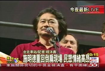 回到“倒扁”活动现场后,施明德上台向民众信心喊话,他痛斥陈水扁不要忽视人民的声音,不要以为红军如此就会溃散;“倒扁”的民众仍会继续下去,直到陈水扁下台的那一天。施明德也向大家说明,目前他的身体状况良好,会坚持下去。(赵静)