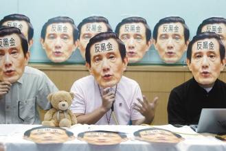 花莲青年戴马英九面具反黑金。图片来源:联合报