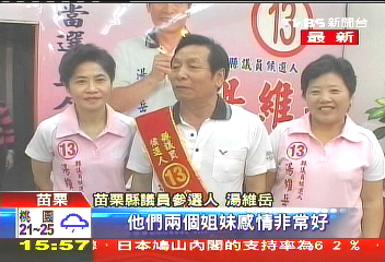 苗栗县议员参选人汤维岳自嘲说:“至少我比别人多一双腿(拜票),她们两个姐妹感情非常好,向来和乐融融。”汤维岳口中的“姐妹”,指的是就大、小老婆,一夫二妻共处30年,还一同出来拜票,甚至强调一人当选,三人服务。