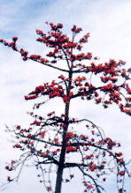 木棉属木棉科,木棉属。原产印度、缅甸及爪哇一带,荷兰人将其引进台湾,落叶大乔木,株高1020公尺,木棉的树干从小时候起就有了明显的瘤刺,看来面目狰狞,煞是有趣。它的小枝轮生而呈水平开展,掌状复叶有五至七枚小叶;花朵橙黄或橙红,厚肉质,直径可达八至十二公分,常见成群的蜜蜂在花丛间飞舞,忙得不可开交;其雄蕊构造奇妙无比,多数的花丝居然整整齐齐地排成六束,好似受过特别训练一般,教人愈看愈喜爱。花朵凋谢后,常会整个掉落。造成树下落英纷陈,另有一种别致的美。每年的5月到7月,木棉的果实会逐一裂开,将种子散放出来,此时往往造成绵绵白絮凌空翱翔的奇景。