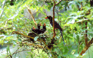 通常成小群出现于中、低海拔的阔叶林及次生林中。性群栖、凶悍、喜喧哗,有攻击其它鸟种的习性,常成群呈直线飞行,甚为壮观。以植物果实为食,亦兼食其它鸟类、两栖类及其它哺乳类。台湾特有种,不普遍留鸟。常发出似“嘎─锵、嘎─锵”或“嘎嘎─穗”之声。