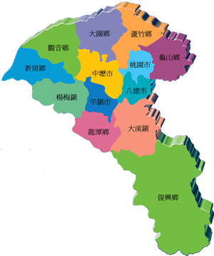 桃园县位于台湾西北部,紧靠台北都会区,大部分是连绵不断的丘陵台地,地形呈西北向东南的狭长形,临山面海,自石门水库起经大溪镇东北出县境的大汉溪,将该县划分为东南和西北两大部分。东南部分为海拔三百公尺以上的丘陵地、阶地及山岳,地势向东南渐次升高,山势峻峭,河谷窄狭。西北部地势则较为平缓,台地、阶地甚为发达,河流短而呈放射状入海。