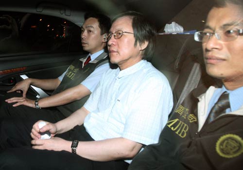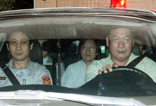 台湾特侦组30日晚间传唤台当局前“国安会秘书长”邱义仁(中)及5名证人到案。检察官侦讯后认为邱义仁涉嫌利用职务诈取财物罪嫌,于31日凌晨将邱义仁移送法院声请羁押禁见。台北法院审理后裁准,邱义仁坐进囚车,被送往台北看守所。“中央社”图