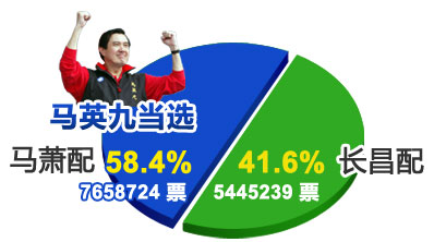 新华网台北3月22日电 据台湾媒体报道,台湾地区领导人选举22日举行了投票。中国国民党籍候选人马英九、萧万长获胜,得票765.87万张,得票率为58.45%;民进党籍候选人谢长廷、苏贞昌得票544.52万张,得票率为41.55%。