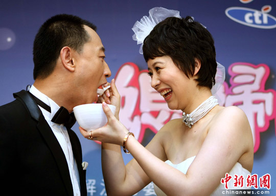 6月7日相关单位在台北举行记者会,剧中毛豆豆扮演者海清、余味扮演者黄海波身著结婚礼服到场与记者、影迷互动,会上“小两口”相互喂食的甜蜜情节,将活动推向高潮。中新社记者 宋吉河 摄