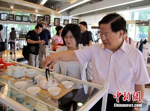 正在台湾参访的中华文化联谊会名誉会长蔡武9月4日来到位于南投县的台湾工艺研究发展中心参观,他对台湾的手工艺品很感兴趣。中新社记者 路梅 摄
