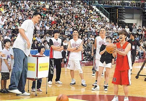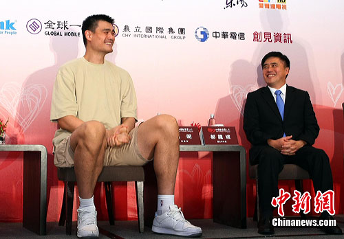 “2010姚基金慈善之旅”7月27日在台北举行记者会,姚明与台北市长郝龙斌等出席。据悉,由台湾和上海组成的心连心队与美国职业篮球明星队,将于28日在台北小巨蛋举行表演赛,姚明希望球迷通过欣赏精彩的比赛,加入公益活动行列。中新社发 宋吉河 摄