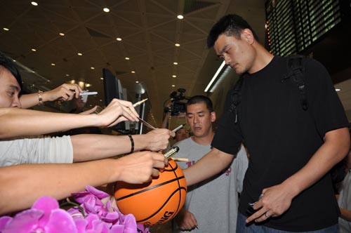 美国职篮NBA休斯敦火箭队中锋姚明(前右),26日下午搭机抵达桃园机场,大批球迷守候在大厅,姚明应球迷要求签名。 来源:“中央社”