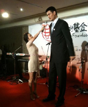 侯佩岑担任“姚基金慈善之旅”记者会主持人,身高的差距让画面相当有趣。图片来源:台湾“今日新闻网”
