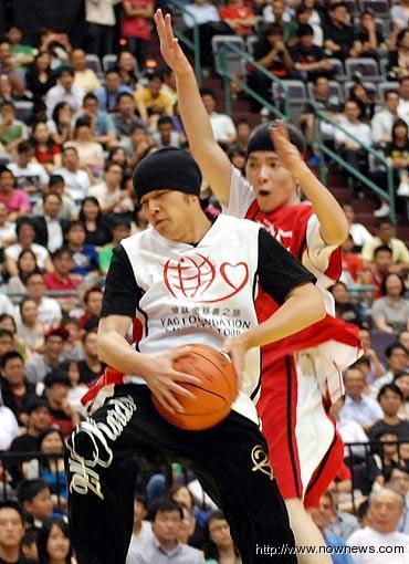 罗志祥(右)投篮时“笑”果十足,将活动的欢乐气氛带进最高潮。
