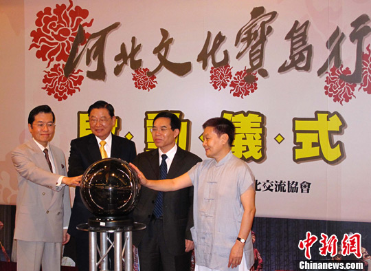 河北文化宝岛行活动8月27日在台北正式启动,河北省委常委、宣传部长聂辰席(右二)率河北省文化代表团一行百余人将在台湾进行为期一周的文化交流及展演活动。图为该活动在台北举行启动仪式。台湾海基会董事长江丙坤(左二)等出席启动仪式。中新社发路梅 摄